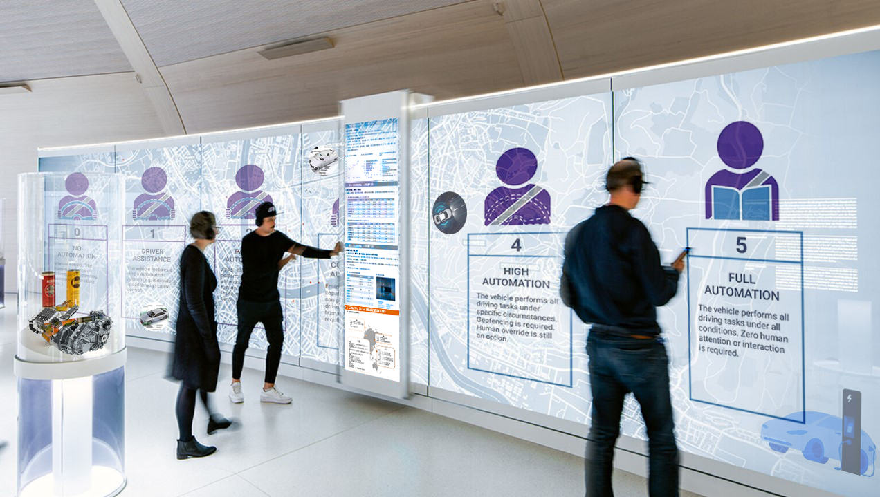 通过在布置好的轨道上安装好传感电路装置,同时在其展示墙面上设置不同的触控点位,当用户推动滑轨屏至相应的感应点位时,传感信号会被触发,滑轨屏就会展示相应的内容,以此来为用户介绍相关信息,包括图片、文字、视频等。